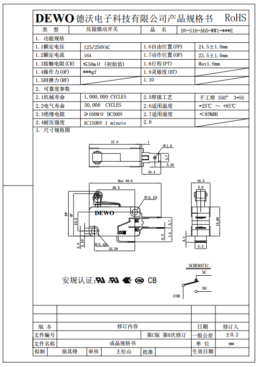 DV-16-A05-WW1-200E型微動開關