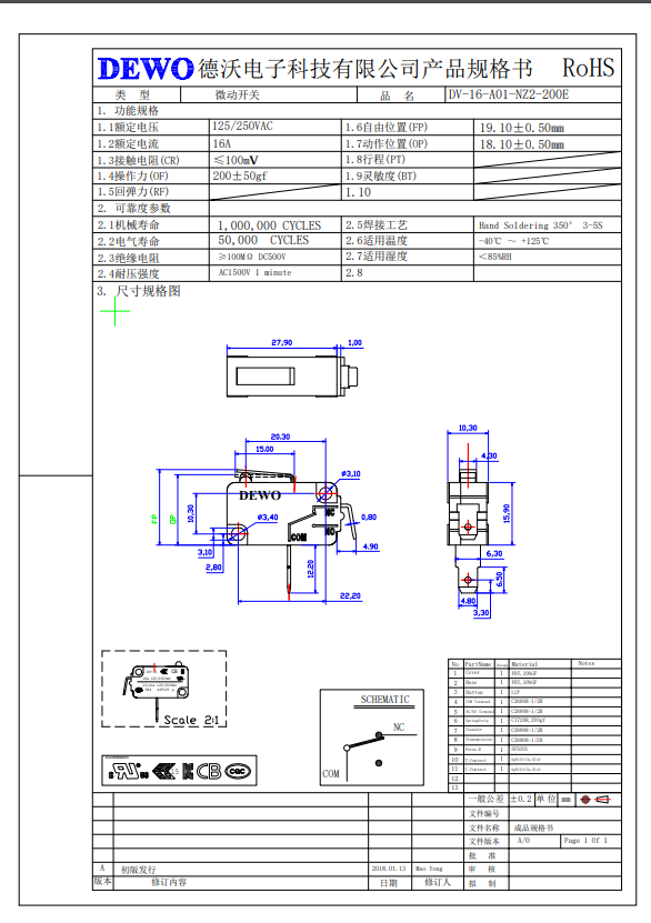 DV-16-A01-NZ2-200E-W型微動開關