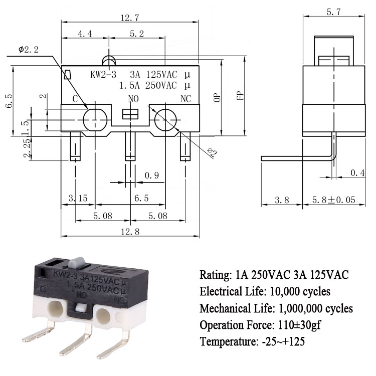 KW2-3-00CL-110-5小型微動開關側彎端子