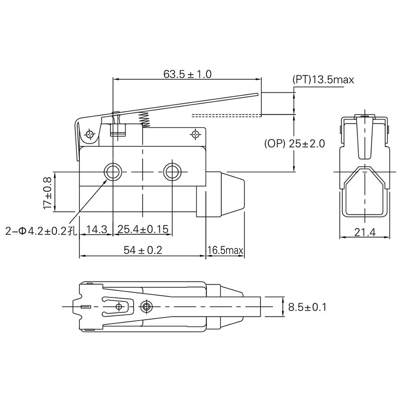 安裝孔間距為25.4mm,與RZ型微動開關相同。